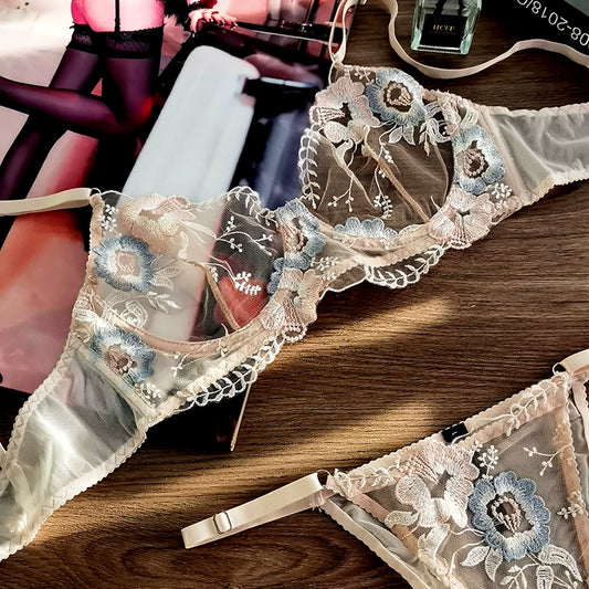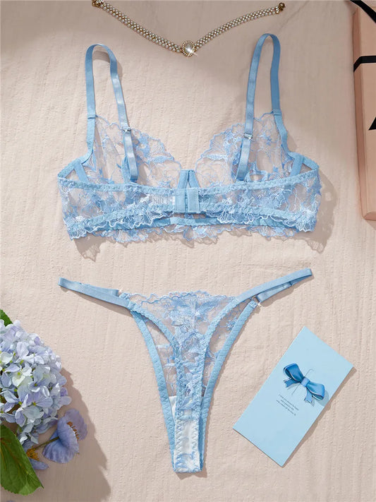 ¥2,972セール価格¥4,990 お得 ¥-2,018 (-68%)単価につきディープブルーフローラル刺繍レースブラショーツセット