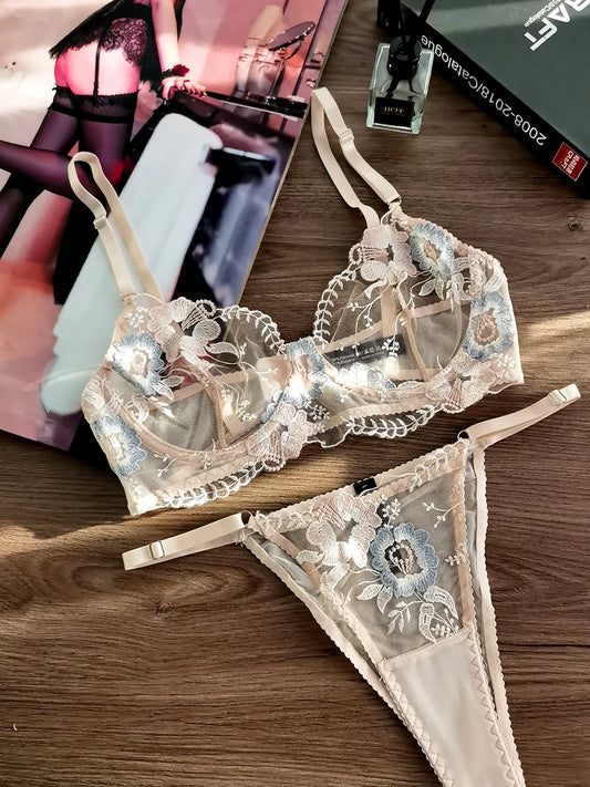 ¥42セール価格¥9,590 お得 ¥-9,548 (-22733%)単価につきラグジュアリーピンクベージュシースルーレース刺繍ブラショーツセット