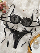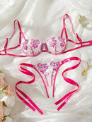 サイドリボンがデザインされたフローラルレース刺繍シースルーレースのパットレスブラショーツセット。ダークブルー、レッド、ブラックの3色展開です。海外サイズになりますので小さめを選択してください。※サイズ表の表記から1-3cm程度の誤差がある場合があります。ご了承ください。