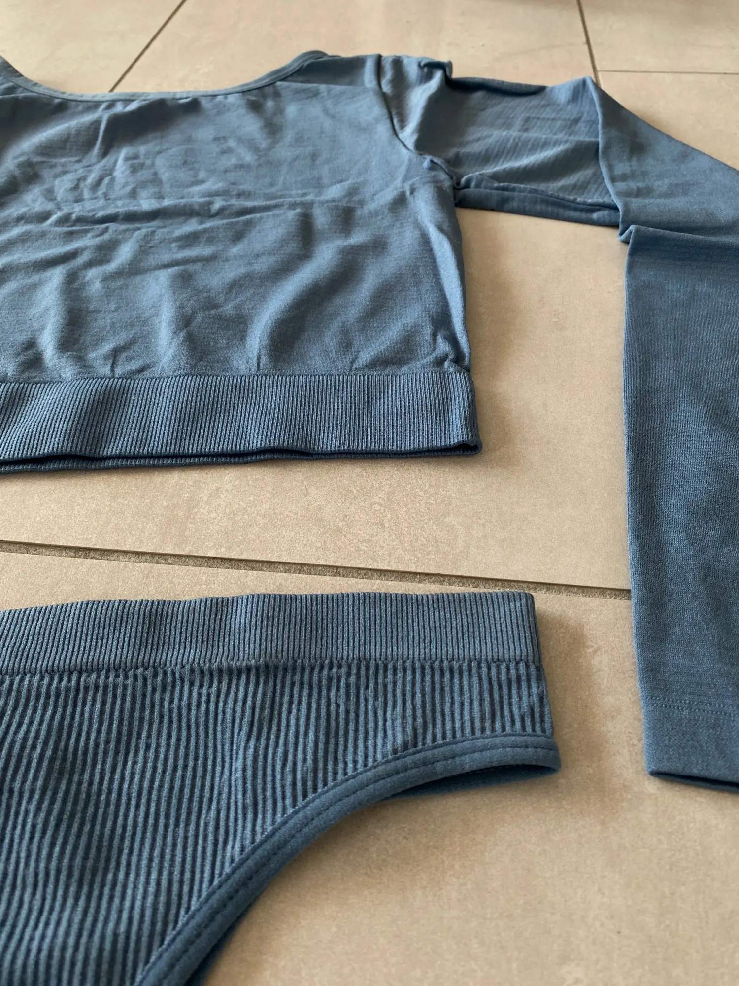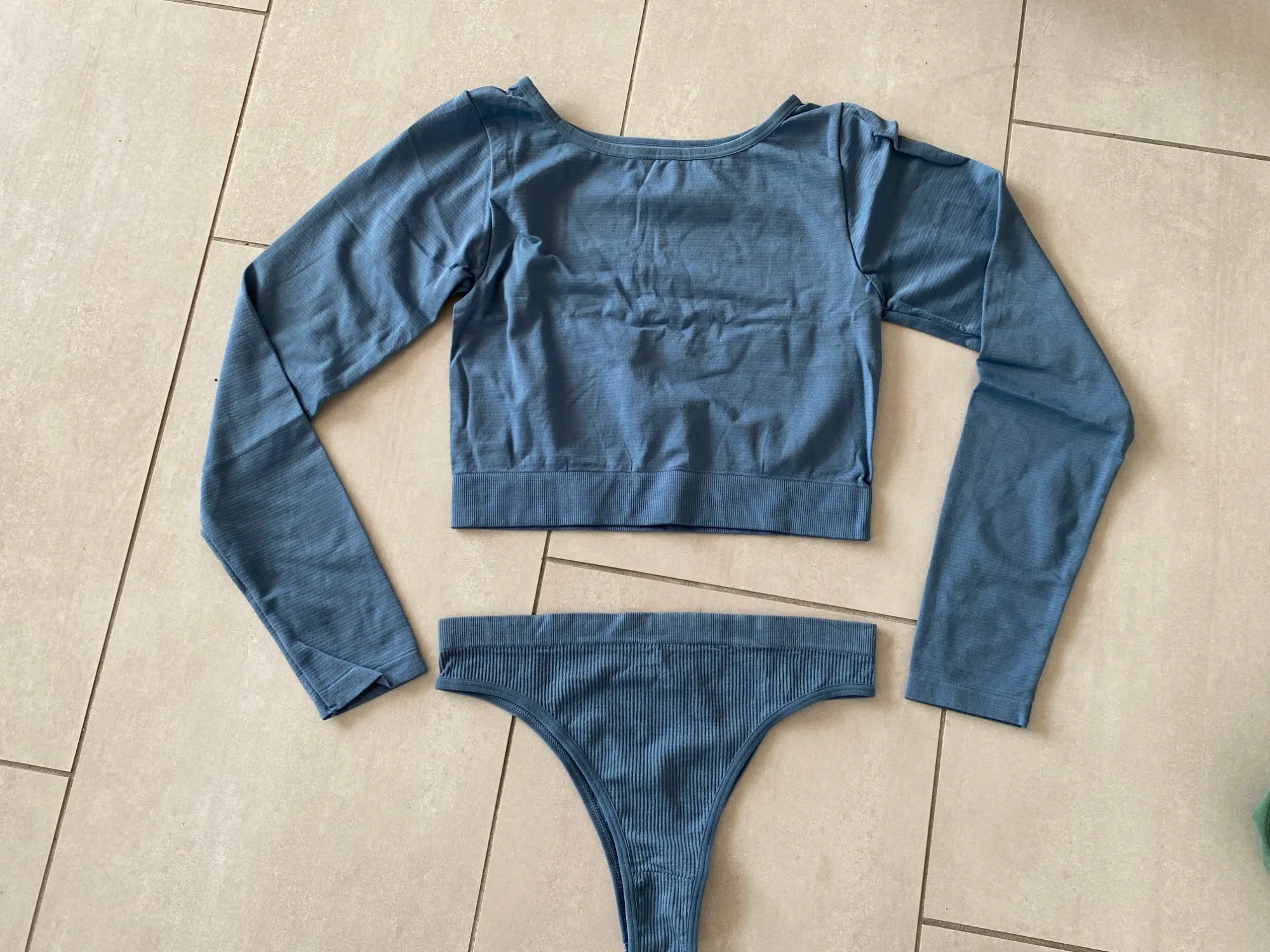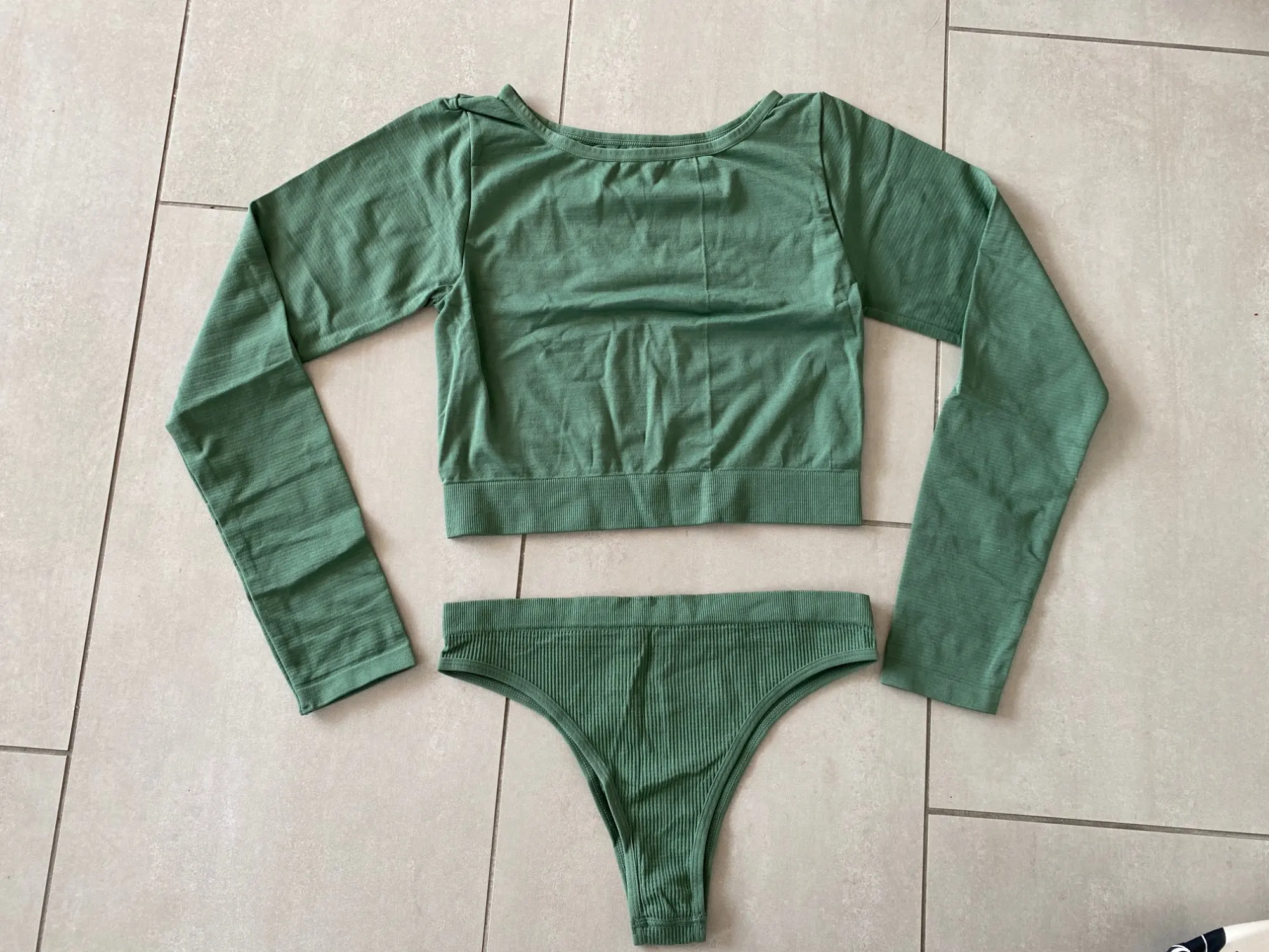 Seamless Ribbed Long Sleeve Top Low Waist Thongs Set