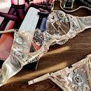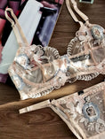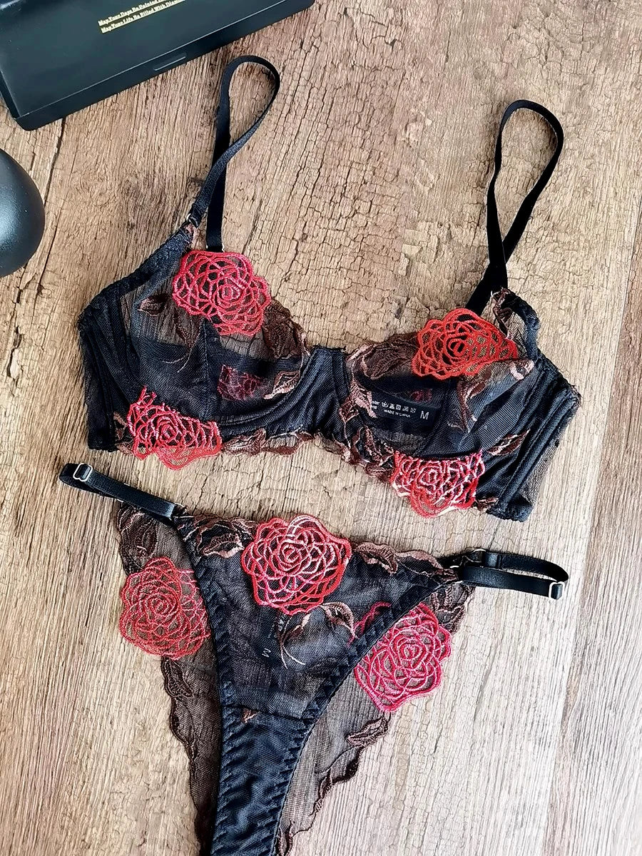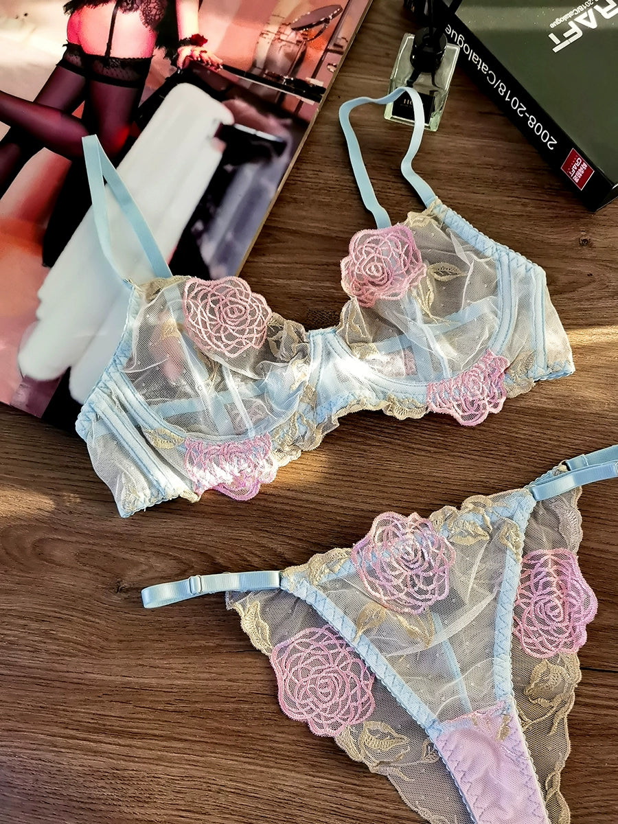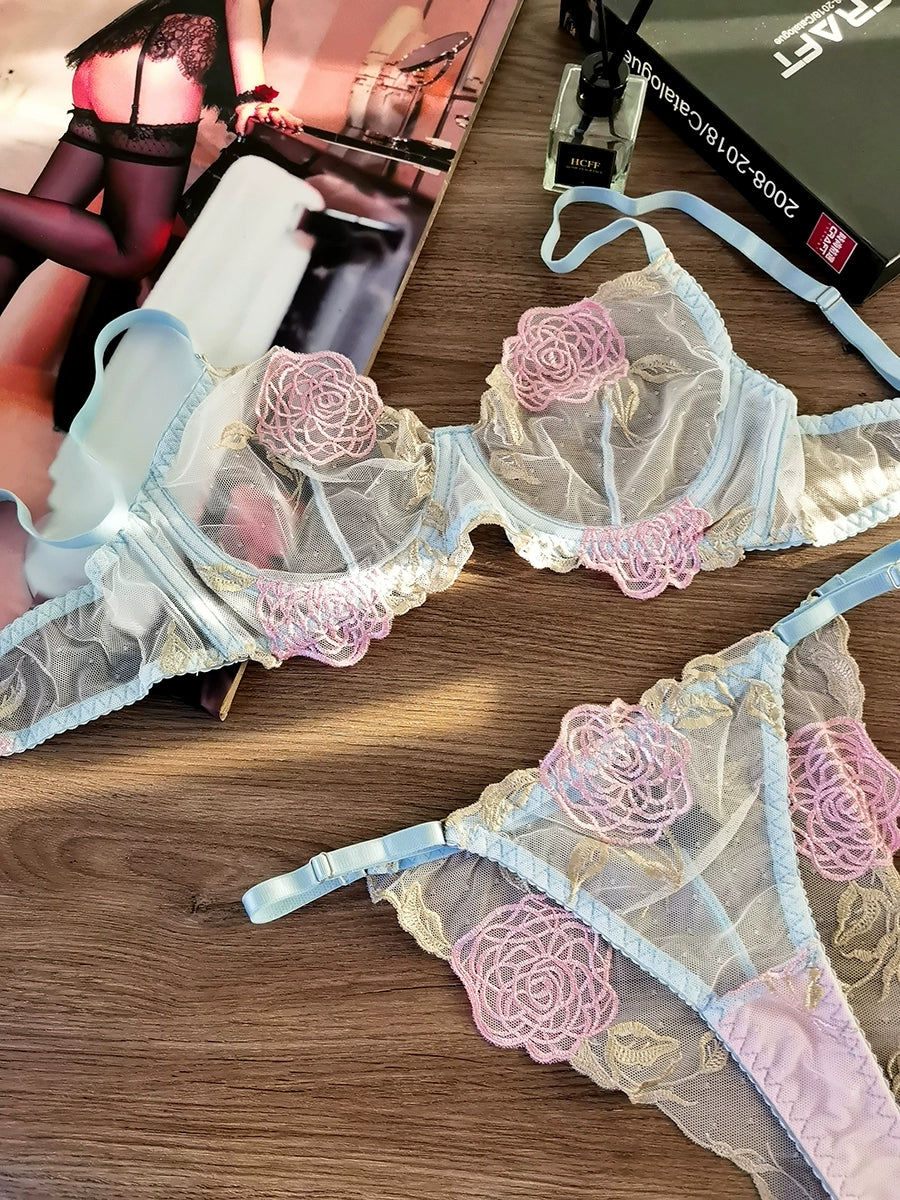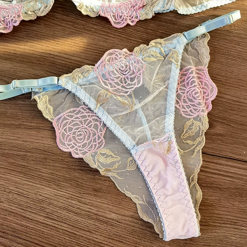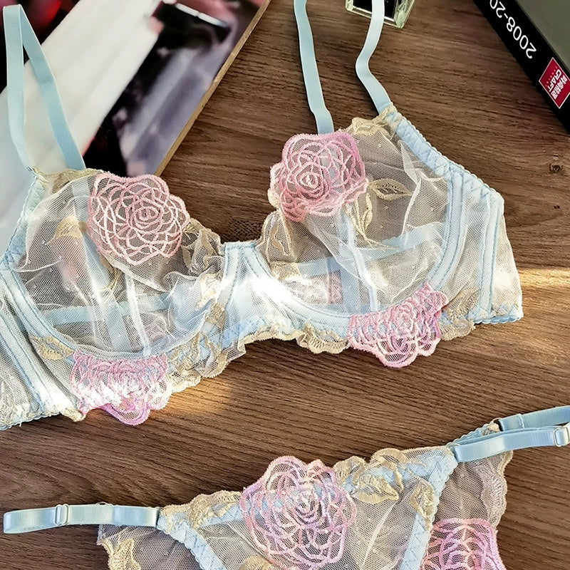 繊細なフローラルレース刺繍シースルーレースのパットレスブラショーツセット。ベージュ、サイトブルー、レッド2色の合計4色展開です。海外サイズになりますので小さめを選択してください。※サイズ表の表記から1-3cm程度の誤差がある場合があります。ご了承ください。